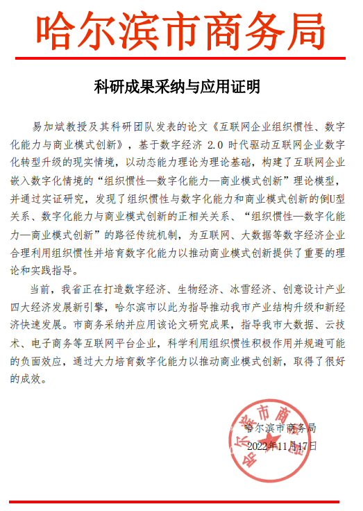 商务学院已逐步成为新商科人才的培养基地,中国特色管理学理论体系的创新阵地,服务龙江经济社会发展的高端智库平台。未来,商务学院将以着力构建高质量工商管理学科人才培养体系,着力打造数智化管理与实践的交流平台,研究智能组织的重大问题,为企业数智化转型提供指导方案,传播好中国式现代化管理经验,更好服务国家大局助力推动高质量发展。