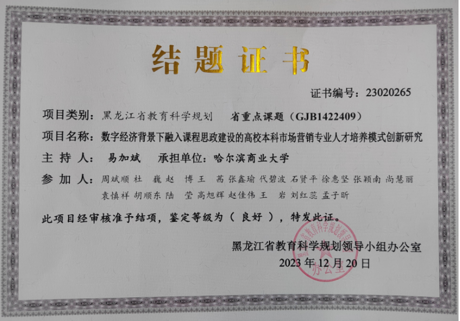 商务学院以《黑龙江省“十四五”数字经济发展规划》为目标方向,以国家一流本科专业、一流本科课程建设为依托,打造“新商科教育+数字技术+数智管理人才”动态联动新范式,扎实推进高质量数智管理人才培养改革。2021年,工商管理和市场营销专业成为国家一流本科建设专业。2024年,工商管理和市场营销专业所在档次均为B++,获4星级评定。