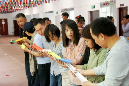 活动现场,各组师生们全神贯注,不断交流策略,调整站位姿势。工商管理教研室的师生们配合无间,以流畅的传递和稳定的节奏率先完成任务,赢得本项目的胜利,充分展现了团队的凝聚力。