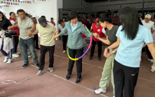 在“环环相扣”项目中,四个教研室的师生们分别手拉手连成一排,需要通过身体的协调配合让呼啦圈依次穿过每位成员。既要保持队形的完整,又要确保呼啦圈的顺利传递,考验着每位参与者的肢体协调性和团队配合度。