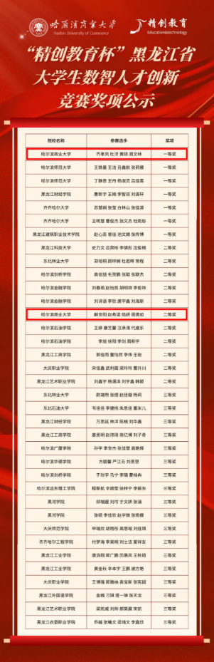 为贯彻落实《黑龙江省教育厅关于进一步鼓励大学生创新创业的通知》指示精神,全面深化高校创新创业教育改革,大力培养符合区域经济社会所需的数智创新人才,强化学生以成果为导向的管理和责任意识,提升用信息化手段处理实际问题的能力,2023年10月28日,由黑龙江省普通高等学校创新创业教育指导委员会主办,哈尔滨商业大学承办的“精创教育杯”黑龙江省大学生数智人才创新竞赛在线上顺利举行。