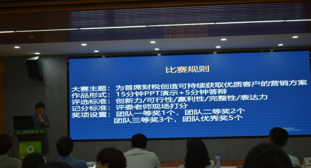 首席财税创始人张鹤总代表企业致辞,表示首席财税愿意为商务学子搭建一个学以致用、展现才华、碰撞智慧的平台。面对真实的商业命题,希望同学们可以开放思维、深入调研、大胆创意、严谨论证,展现出商务学子的卓越实力和精彩纷呈的营销策划方案!